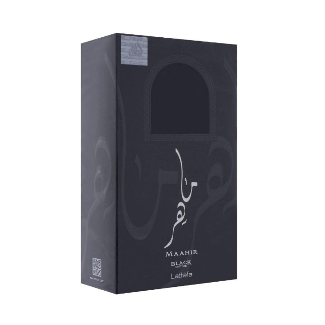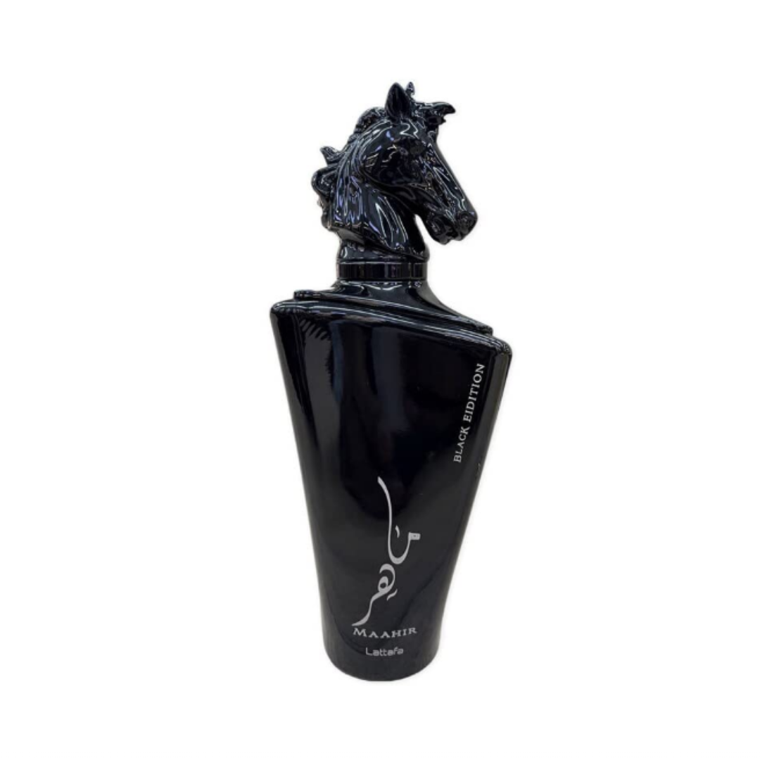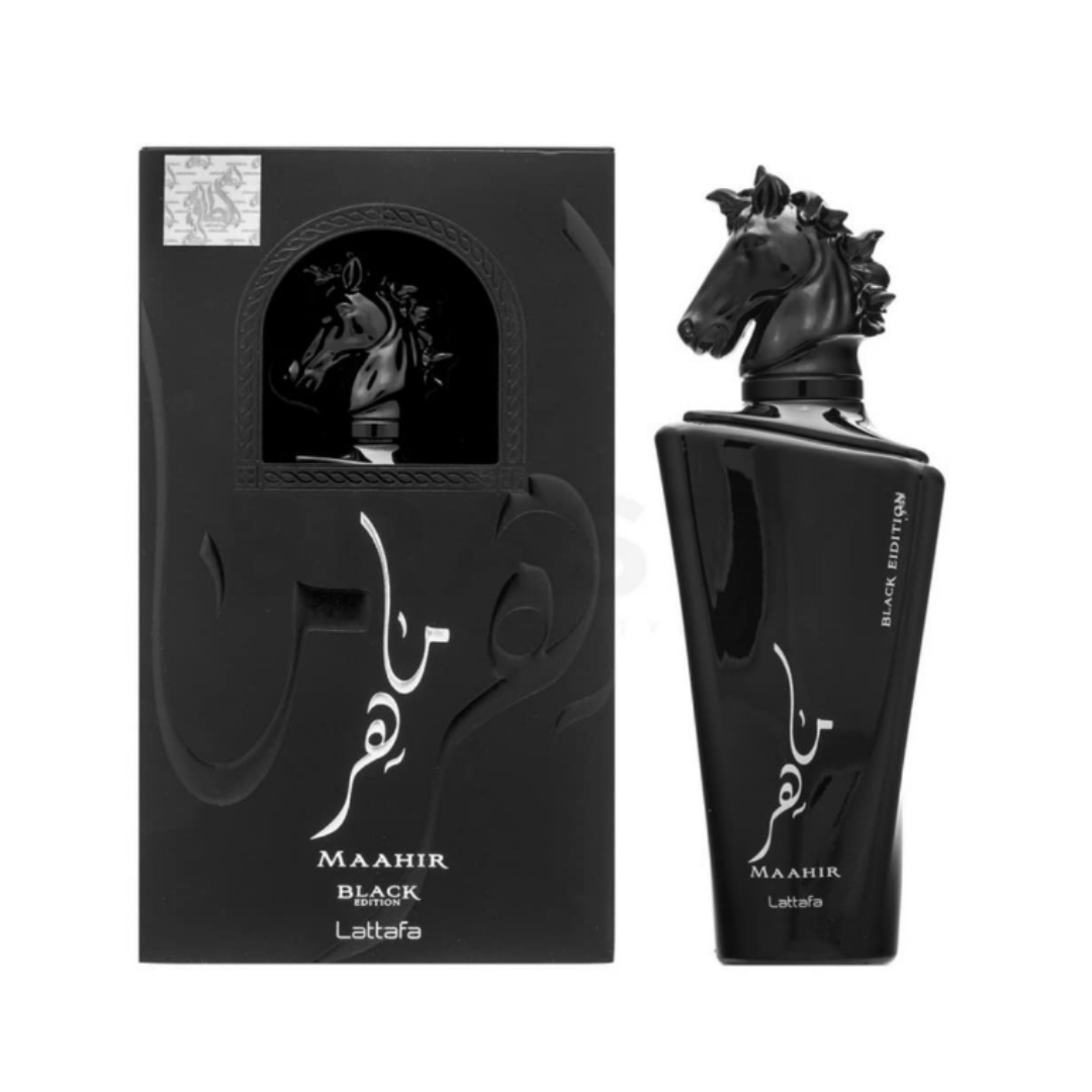 Command attention with the intense mystery of Lattafa Maahir Black Edition, a sophisticated and smoky Eau de Parfum for men. Housed in its striking, highly detailed matte black horse head bottle, this fragrance is a statement of power and masculine refinement. It opens with an intriguing and spicy blend of black Pepper, savory Saffron, and a touch of fresh Violet, creating an immediately complex and deep introduction. The heart plunges into a rich, dark core of smoky Incense, warm Caramel, and creamy Patchouli, balancing the smoke with a smooth sweetness. The long-lasting dry down is defined by intense Oud, leather Woody Notes, and sensual Musk, ensuring a powerful and magnetic trail. Maahir Black Edition is the perfect choice for cold weather, evening events, and the man who embodies bold, dark elegance.